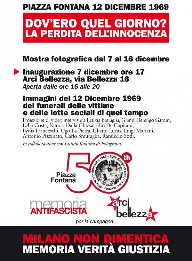 Immagini del 12 dicembre 1969, dei funerali delle vittime e delle lotte sociali di quel tempo. Inaugurazione mostra: 7 dicembre ore 17,00. Aperta tutti i giorni dalle 16 alle 20 fino al 16 dicembre.