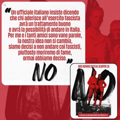 “Un ufficiale italiano insiste dicendo che chi aderisce all’esercito fascista avrà un trattamento buono e avrà la possibilità di andare in Italia. per me e i tanti amici sono vane parole, la nostra idea non si cambia, siamo decisi a non andare coi fascisti, piuttosto moriremo di fame, ormai abbiamo deciso”