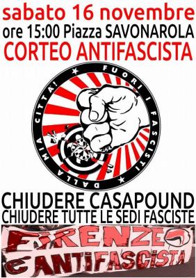 Dopo quanto accaduto in piazza della Repubblica con l’aggressione di tre antifascisti da parte di una decina di appartenenti a Casa Pound, Firenze Antifascista lancia la mobilitazione per sabato prossimo. Rivolgiamo l’appello a tutte le realtà del territorio e non solo, a tutti coloro che si riconoscono nei valori e nella pratica dell'antifascismo per promuovere e partecipare al corteo di Firenze, per ribadire che in questa città i fascisti e la loro violenza squadrista non devono più trovare spazio e smascherare la catena di complicità di chi consente loro di avere agibilità concedendogli la sala di un bar, una sede in affitto o appoggio politico.