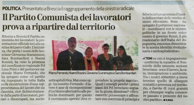 Articolo pubblicato dal quotidiano Bresciaoggi in occasione della presentazione pubblica della sezione di Brescia del Pcl.
