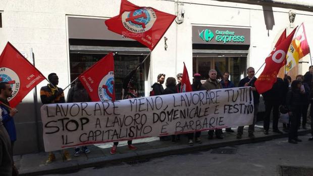 La giornata è iniziata con un partecipato presidio davanti al supermercato della Carrefur in via Ricasoli, aperto nel giorno della festa dei lavoratori. Per quasi due ore decine di militanti hanno esposto striscioni, volantinato, parlato con le persone che entravano nel supermercato invitandole al boicottaggio. Abbiamo riscontrato una notevole attenzione alle tematiche esposte, molte persone hanno deciso di non entrare a fare la spesa e se ne sono andate con il volantino in mano, cosa ancora più importante è stata la reazione dei lavoratori del Carrefur che hanno deciso di uscire per parlare con i manifestanti e per spiegare come si trovano in situazione di ricatto e costretti a lavorare anche nei giorni festivi.