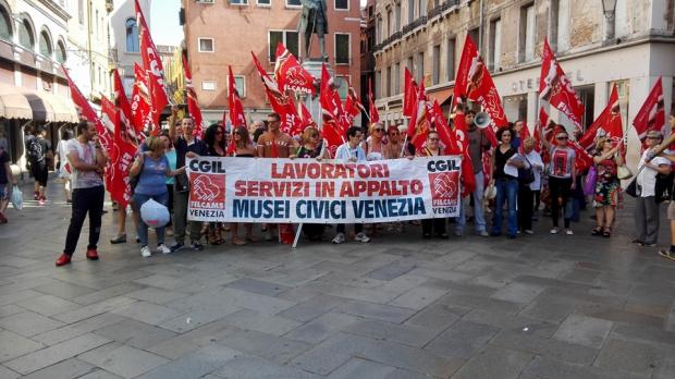 Dopo gli scioperi del 29 e 30 luglio, terzo giorno di sciopero dei lavoratori e delle lavoratrici dei servizi in appalto dei musei civici veneziani. I lavoratori e le lavoratrici difendono i posti di lavoro, i diritti sindacali e contrattuali in vista del prossimo cambio d’appalto previsto per la primavera del 2017. Lo sciopero, come nei giorni precedenti, ha avuto un evidente successo, con una presenza combattiva in piazza, malgrado il clima intimidatorio che si vive nei posti di lavoro.