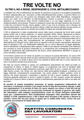 Al servizio di questa prospettiva autonoma, di questo programma indipendente dei lavoratori, è necessario costruire il più ampio fronte di lotta del movimento operaio e delle sue organizzazioni. E al servizio di tutto ciò vanno respinti con chiaro e forte no tutti gli accordi sindacali a perdere che la burocrazia sindacale ha regalato al governo alla vigilia del referendum, nella pubblica amministrazione come nei servizi dell'igiene ambientale, come per i metalmeccanici. Sarà fondamentale respingere nelle assemblee operaie del 19/20/21 dicembre il CCNL metalmeccanico: il no a Renzi deve diventare il no operaio a decenni di sacrifici, l'unico no che può aprire lo spazio per la risalita della china, l'unico che può garantire una soluzione di classe della crisi.