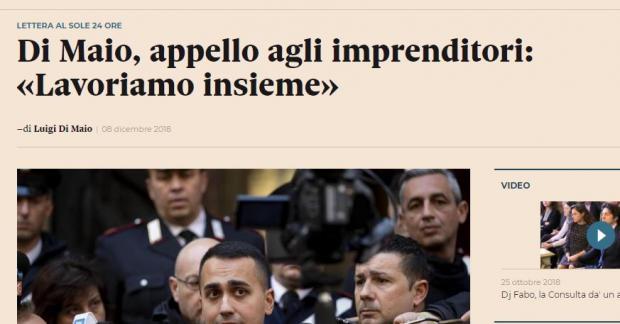 Il quotidiano di Confindustria Il Sole 24 Ore ha ospitato sabato 8 dicembre una lunga lettera aperta agli industriali del Ministro Luigi Di Maio, con tanto di titolo di apertura di prima pagina: “Di Maio alle imprese: lavoriamo insieme”.