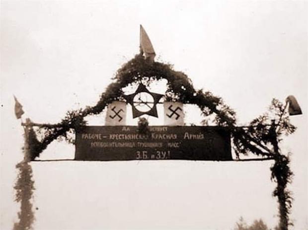 Un arco di "trionfo" sul confine di spartizione della Polonia, a Iwachnivce, coi simboli affiancati della falce e martello iscritte nella stella rossa e le svastiche naziste
