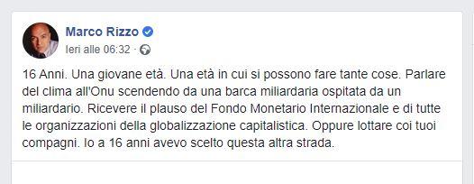 Marco Rizzo ci informa su quello che faceva lui a 16 anni. Ma milioni di sedicenni nelle strade del mondo manifestano oggi la propria denuncia dell’inquinamento del pianeta. Lo fanno con una coscienza politica spesso molto arretrata (per responsabilità non loro) ma con una pulsione progressiva e su un terreno obiettivamente centrale per la contestazione del capitalismo e il futuro dell’umanità.