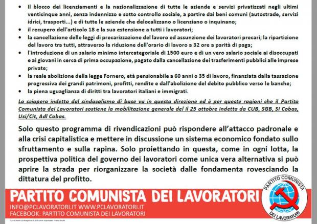 Lo sciopero indetto dal sindacalismo di base va in questa direzione, ed è per queste ragioni che il Partito Comunista dei Lavoratori sostiene la mobilitazione generale del il 25 ottobre indetta da CUB, SGB, SI Cobas, USI/CIT, ADL Cobas.