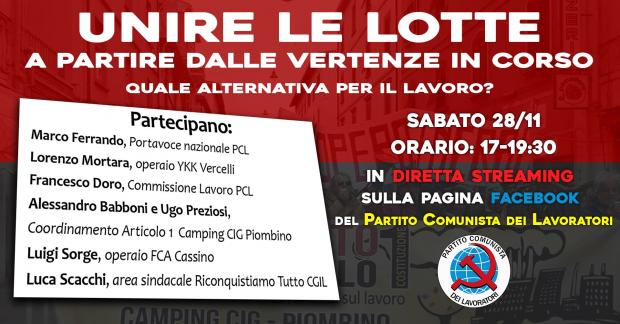 Diretta streaming sabato 28 novembre, ore 17:00, sulla pagina Facebook del Partito Comunista dei Lavoratori