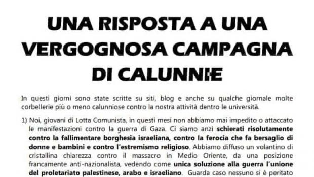 Il cuore del volantino sta nella polemica frontale contro la richiesta di rottura delle collaborazioni istituzionali con le università dello Stato sionista nel campo tecnologico militare. Eppure dovrebbe essere questa una rivendicazione elementare, per quanto parziale, dei comunisti, nella contrapposizione all'imperialismo di casa nostra. Incluso l'imperialismo tricolore.