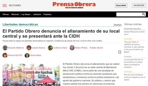 La perquisizione poliziesca della sede nazionale del Partito Obrero a Buenos Aires nella mattina del 3 giugno non è solo un'aperta provocazione ma un salto dell'iniziativa repressiva.