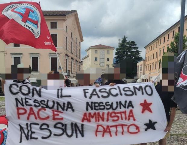 Con il nostro striscione abbiamo voluto anche ricordare due macchie vergognose ed ingiustificabili dell’antifascismo italiano e vicentino. In primo luogo, il vile tradimento operato nel 1946 dal PCI stalinista e dal suo segretario Palmiro Togliatti (all’epoca anche ministro di grazia e giustizia nel primo Governo De Gasperi) nel tentativo di accreditarsi agli occhi della borghesia nel governo del capitale. L’Amnistia Togliatti infatti ha permesso a migliaia di fascisti di vedere estinti i propri reati politici (in diversi casi anche molto gravi) e di tornare immacolati alle loro precedenti posizioni all’interno dell’apparato industriale e delle istituzioni borghesi. In secondo luogo, il Patto di Concordia Civica siglato, con l’attivo coinvolgimento dell’allora giunta di centrosinistra, a Schio il 18 maggio 2005 da ANPI, AVL e dal comitato dei famigliari delle vittime dell’eccidio. È utile sottolineare che questo documento sta alla base della legittimità e dello sdoganamento della crescente presenza neofascista in città durante le annuali commemorazioni e non solo.