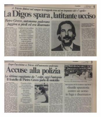 Nei primi giorni di marzo 1985 la Digos di Trieste riceve una segnalazione dal SISDE (il servizio segreto degli Interni) in merito alla presenza di Pietro Greco a Trieste. In quel tempo il questore di Trieste è Antonino Allegra. Sì, proprio colui che era a capo della squadra politica di Milano quando il compagno Giuseppe Pinelli “volò” fuori dalla finestra.