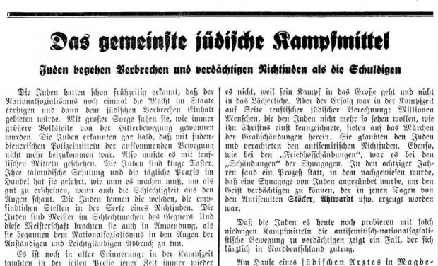 Ma questo non è un calco di uno delle centinaia di articoli apparsi in questi anni: questa è la traduzione letterale di un articolo apparso sul numero 49 di Der Stürmer – il settimanale di propaganda nazista – del dicembre del 1935. Ho solo cambiato i riferimenti.